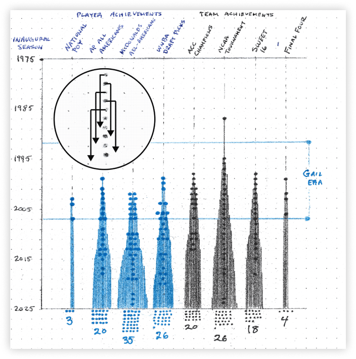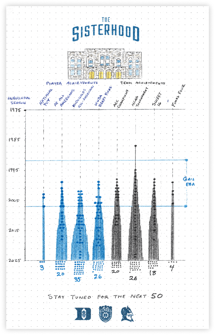 To celebrate Duke Womenās Basketballās 50th anniversary, we were tasked with transforming a vast collection of raw statistics into a cohesive narrative that highlights the programās ups and downs over the past five decades.