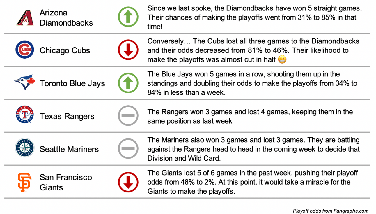 Last week we talked about the 6 MLB ⚾️ teams on the cusp of the playoffs and the important games coming up for them all. Let’s check on how they all did:
