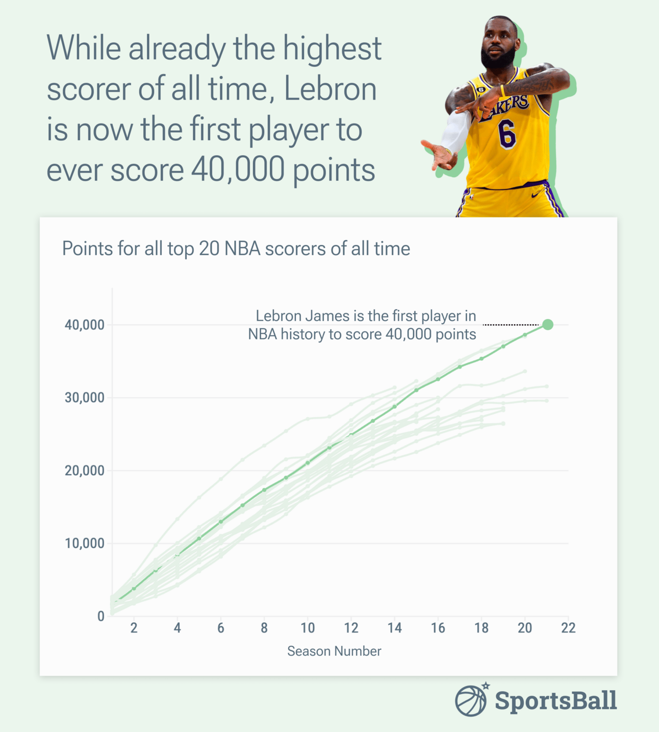 Lebron James already had the record for most points in NBA history and he continues to push past the frontier of known success in basketball with his 40,000th point, the first to ever do it.