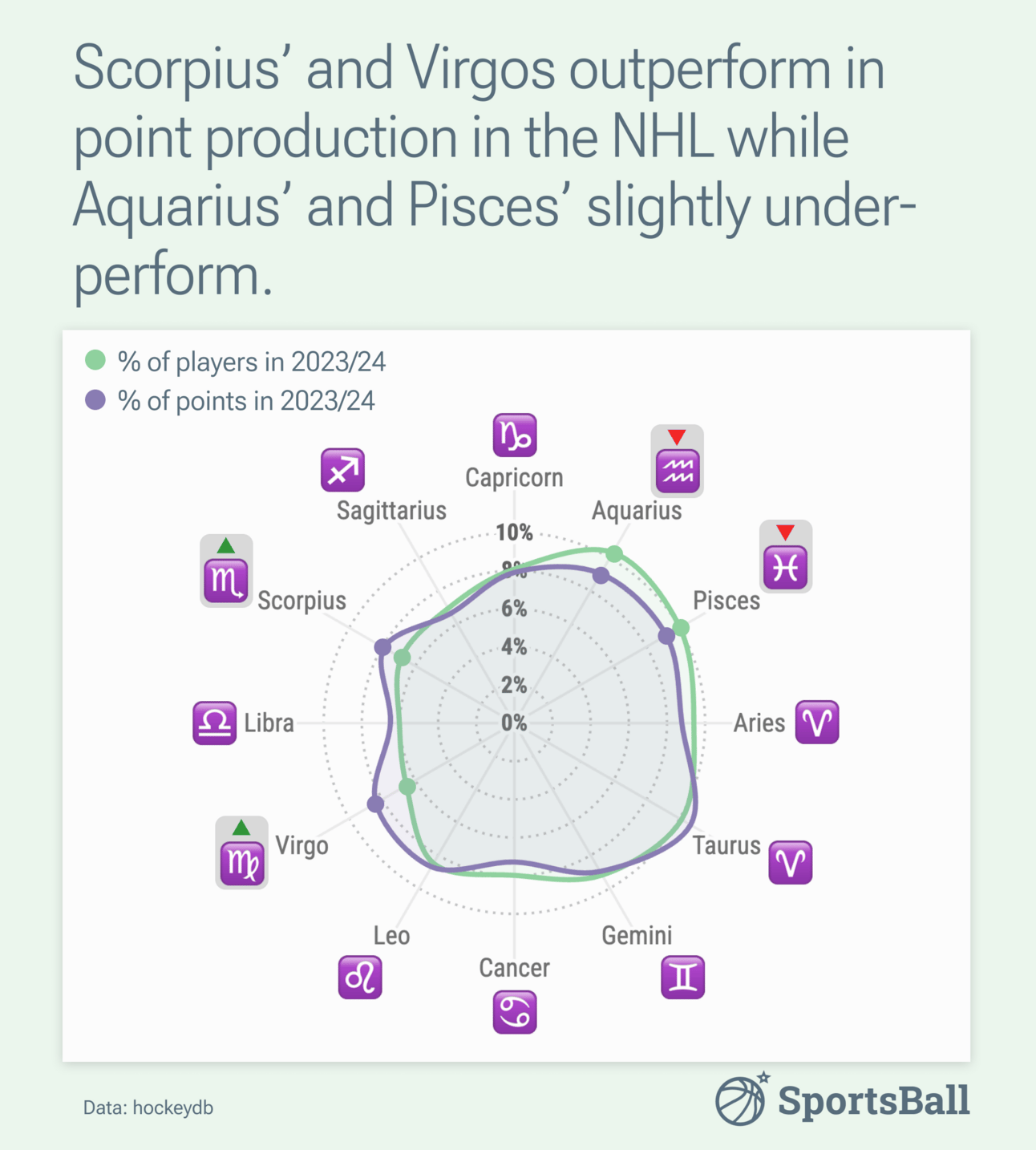 We collected data on the point production of every NHL player and aggregated it to a zodiac level, mapping the percent of all points in the NHL by astrological sign. ♍️