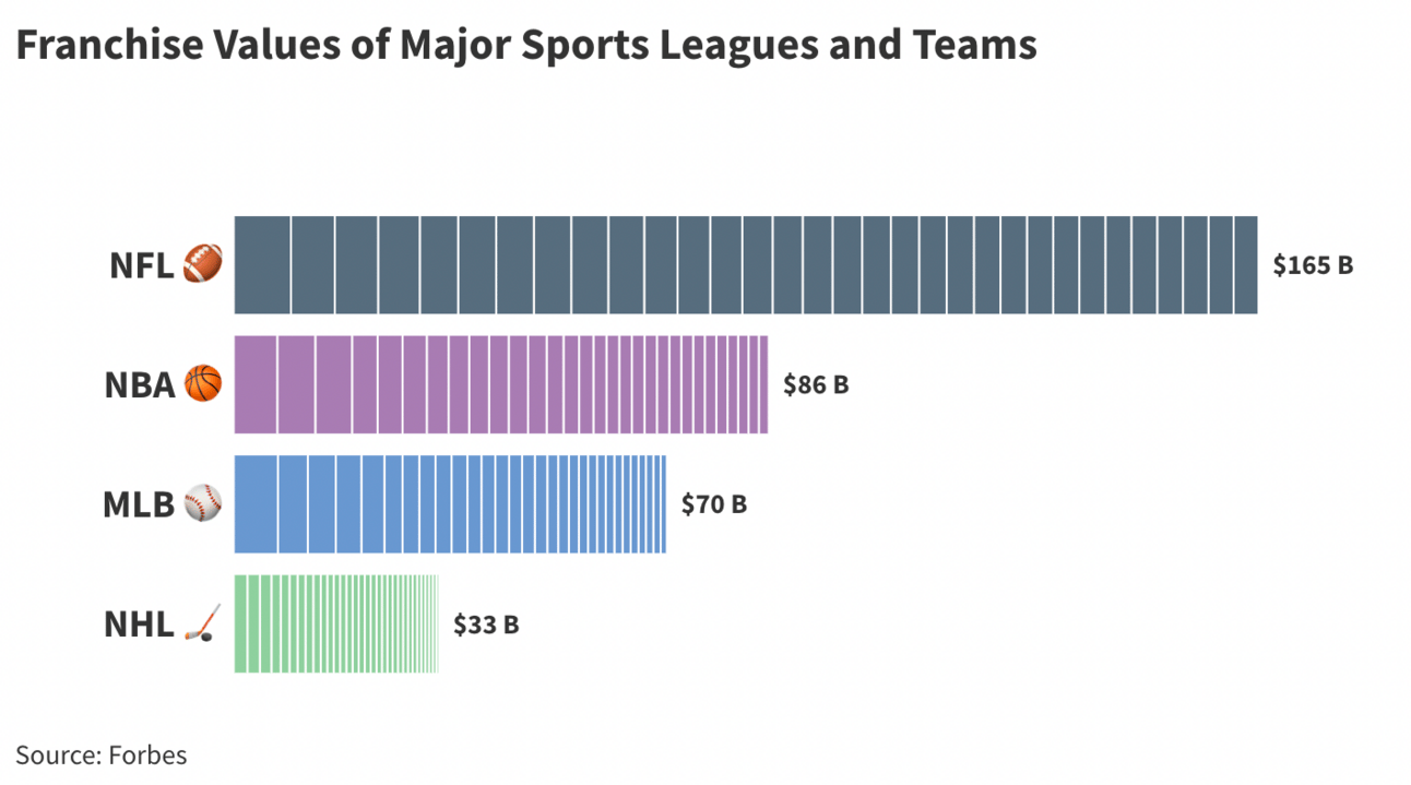 The NHL is by far the smallest of the four major leagues in American sports. A few weeks back, we discussed the NFL’s breadth and size ($165B industry) that dominates media throughout the country. Not quite the case for hockey. Each team is worth $1B on average, making the league worth around $33B and one-fifth the size of the NFL. Below is a chart of each league and team’s value, where you can see that the NHL is much smaller.